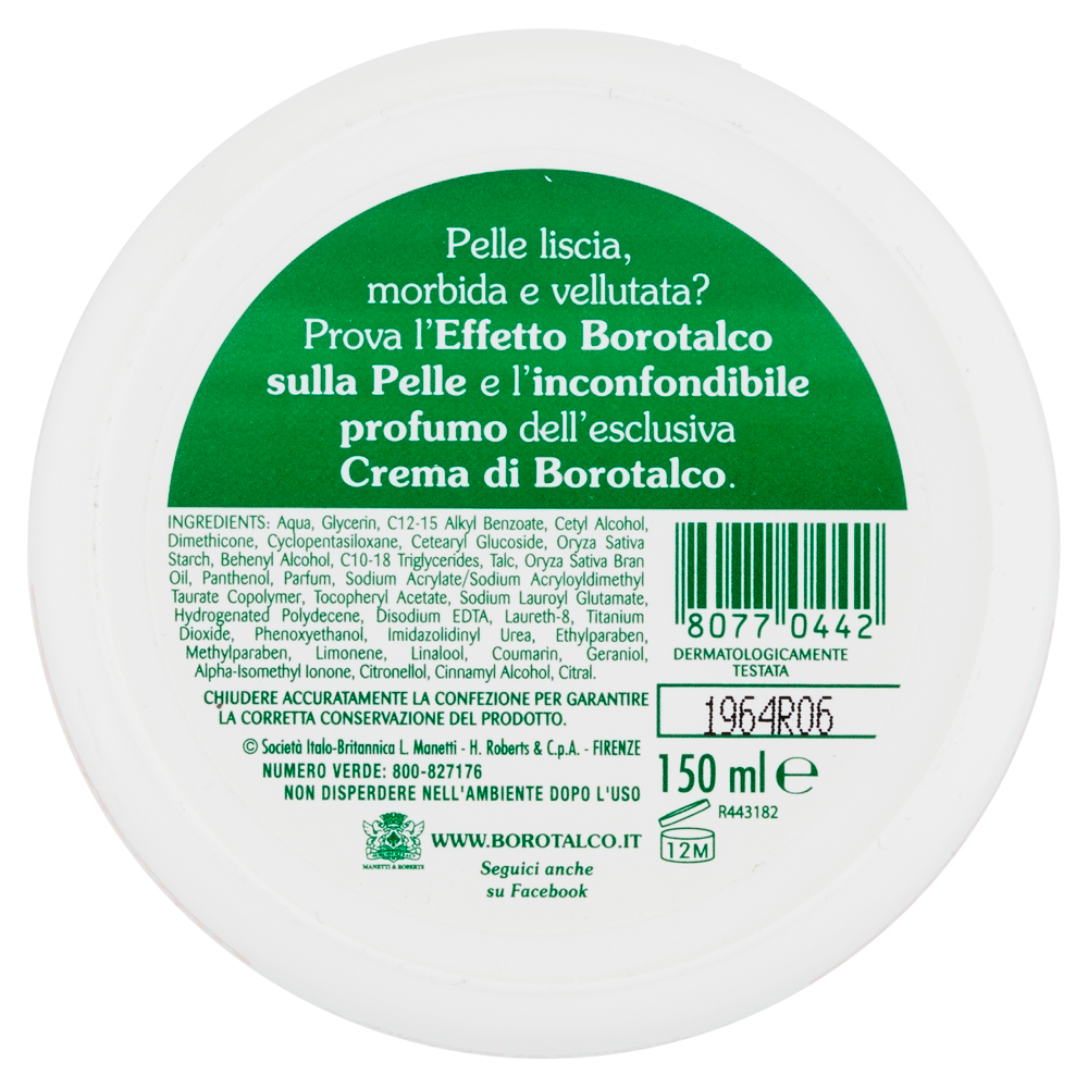 Crème très agréable, parfum classique Borotalco fidèle et doux. Texture veloutée, parfaite au quotidien.