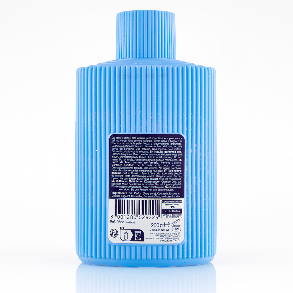 Felce Azzurra Talco Classico 200 g est une poudre corporelle iconique italienne, conçue pour apporter douceur, fraîcheur et confort à la peau. Sa formule traditionnelle, enrichie d’agents apaisants et absorbants, laisse la peau veloutée et agréablement parfumée tout au long de la journée.