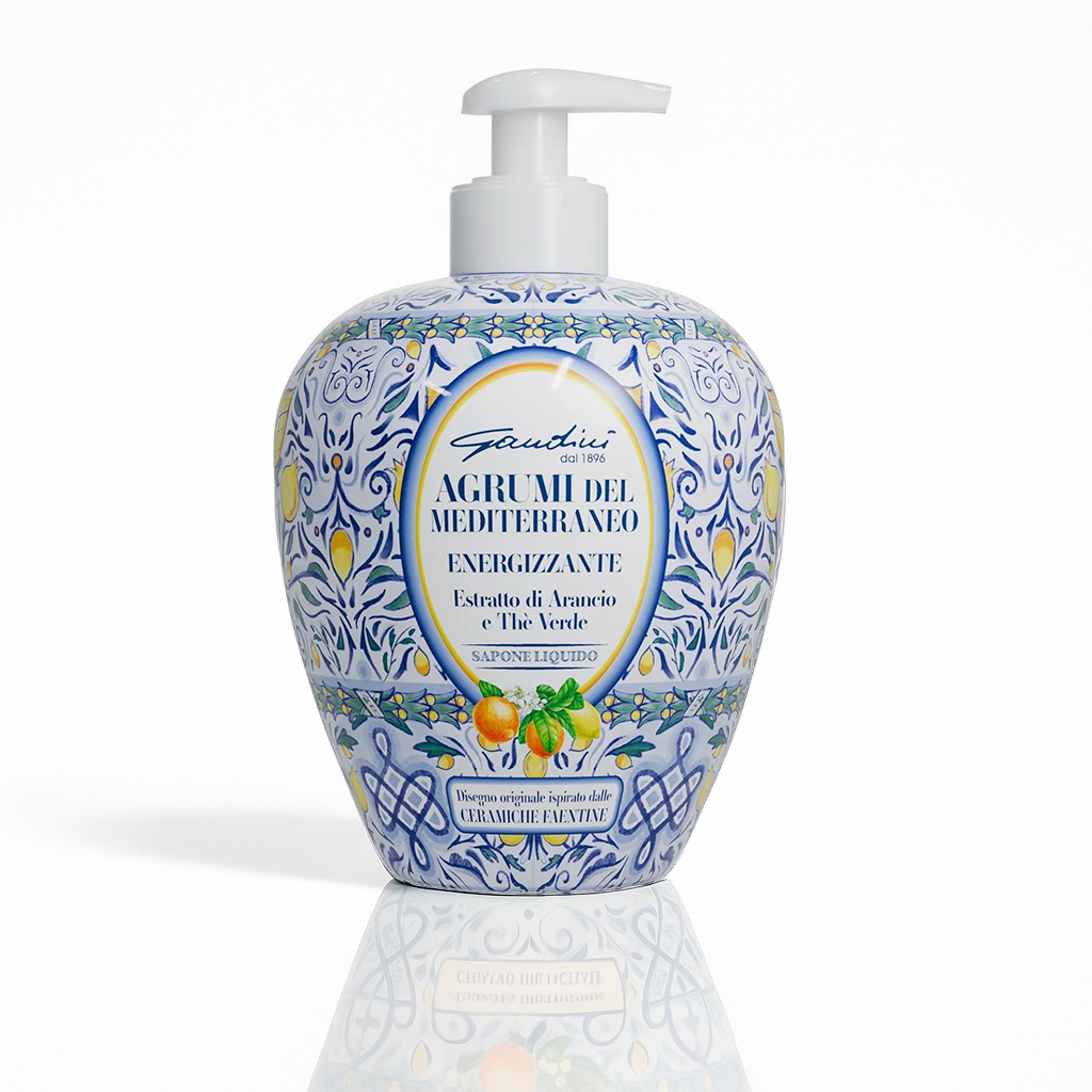 Découvrez l’énergie pétillante et le parfum irrésistible des Agrumes du Méditerranée avec le savon liquide Gandini Italian Maiolica.