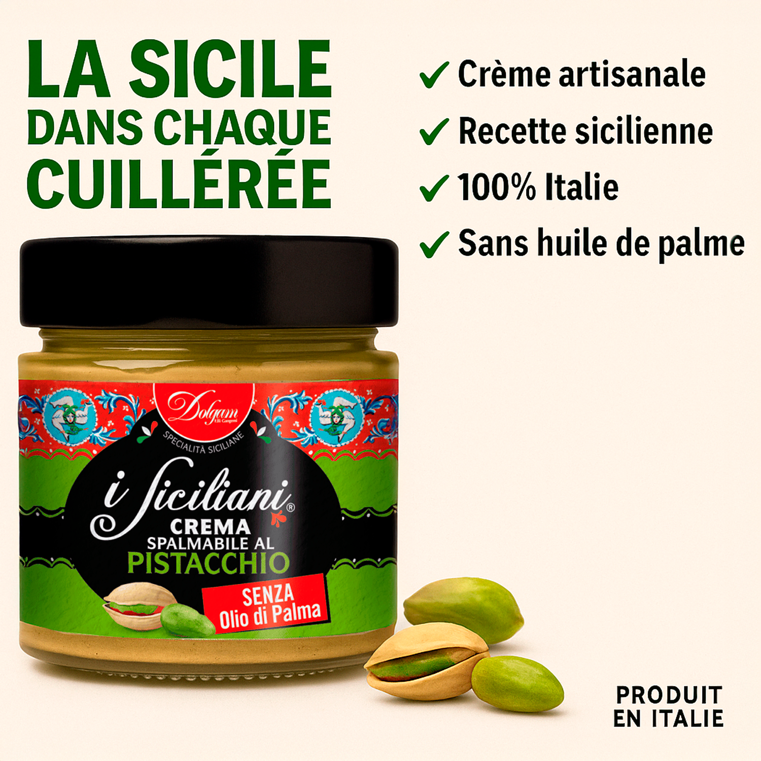Découvrez la véritable saveur de la Sicile avec la crème de pistache croquante Dolgam i Siciliani, une spécialité artisanale préparée à partir de pistaches soigneusement sélectionnées.